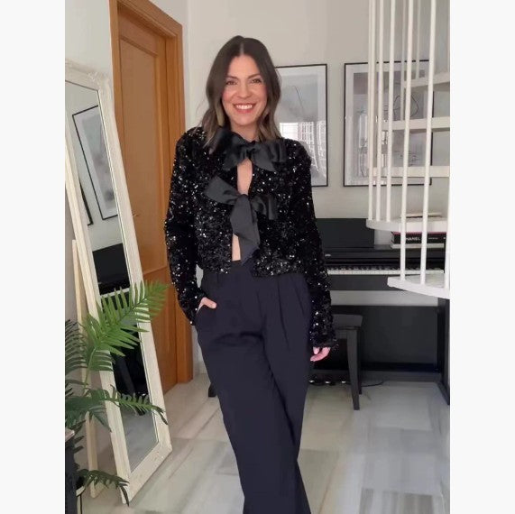 Sequined Back-Bowed Dress Fashion Round Neck Long Sleeve Dresses For Party Daily Shopping Women